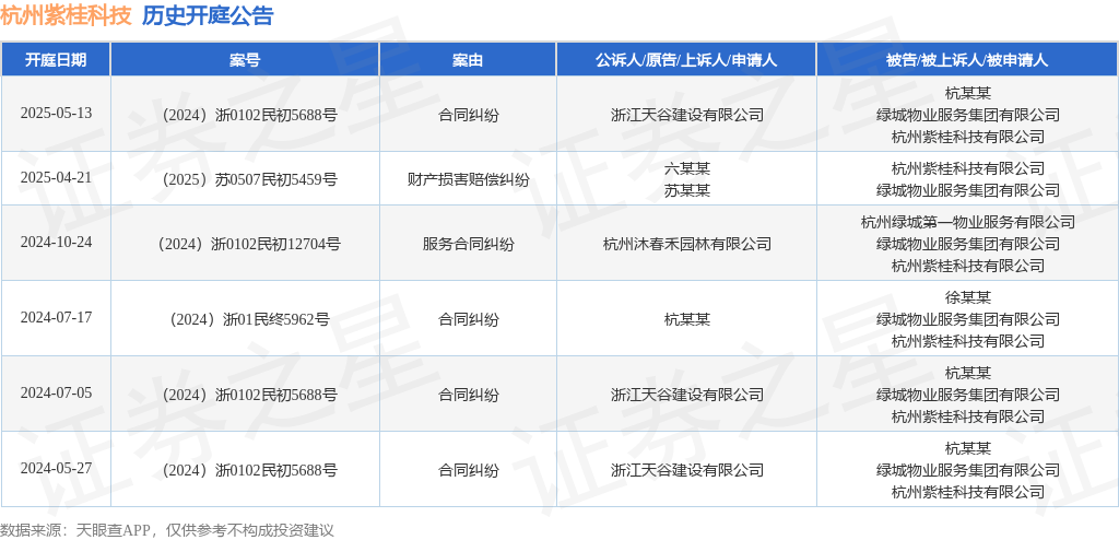 案号:(2024)浙0102民初5688号审理法院:杭州市上城区人民法院案由:合同纠纷当事人信息: 原告/上诉人:浙江天谷建设有限公司 被告/被上诉人:杭某某、绿城物业服务集团有限公司、杭州紫桂科技有限公司开庭日期:2025年5月13日根据统计,近一年内以杭州紫桂科技有限公司为当事人的历史开庭公告有6则,其中案由为“合同纠纷”的公告以4则居首,其次为“服务合同纠纷”有1则,“财产损害赔偿纠纷”有1则。历史开庭公告如下:
